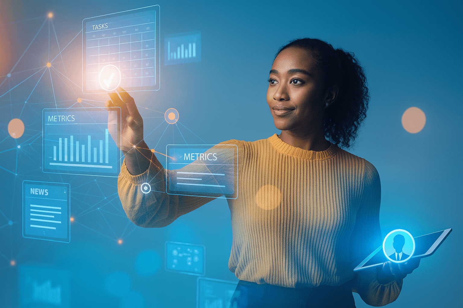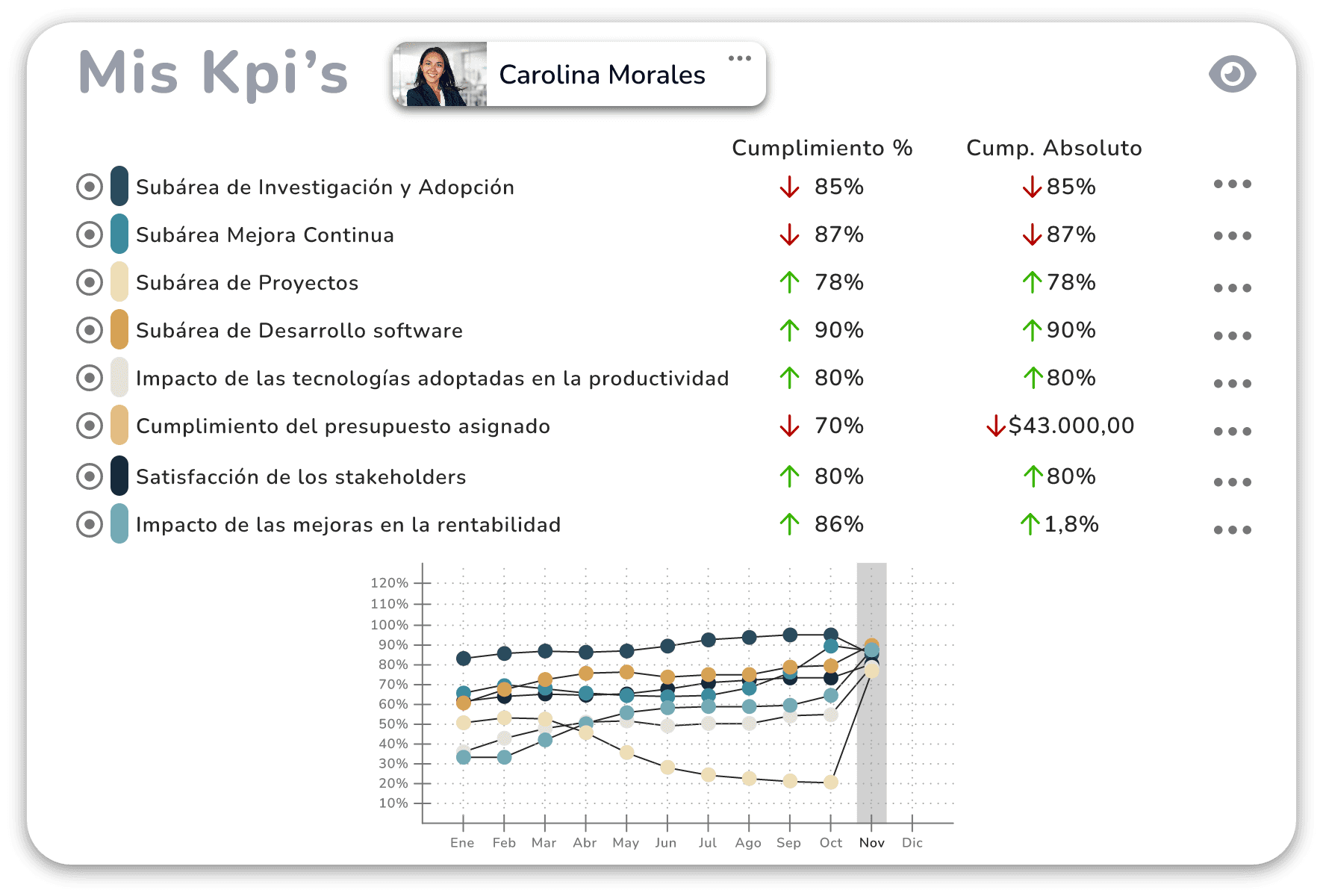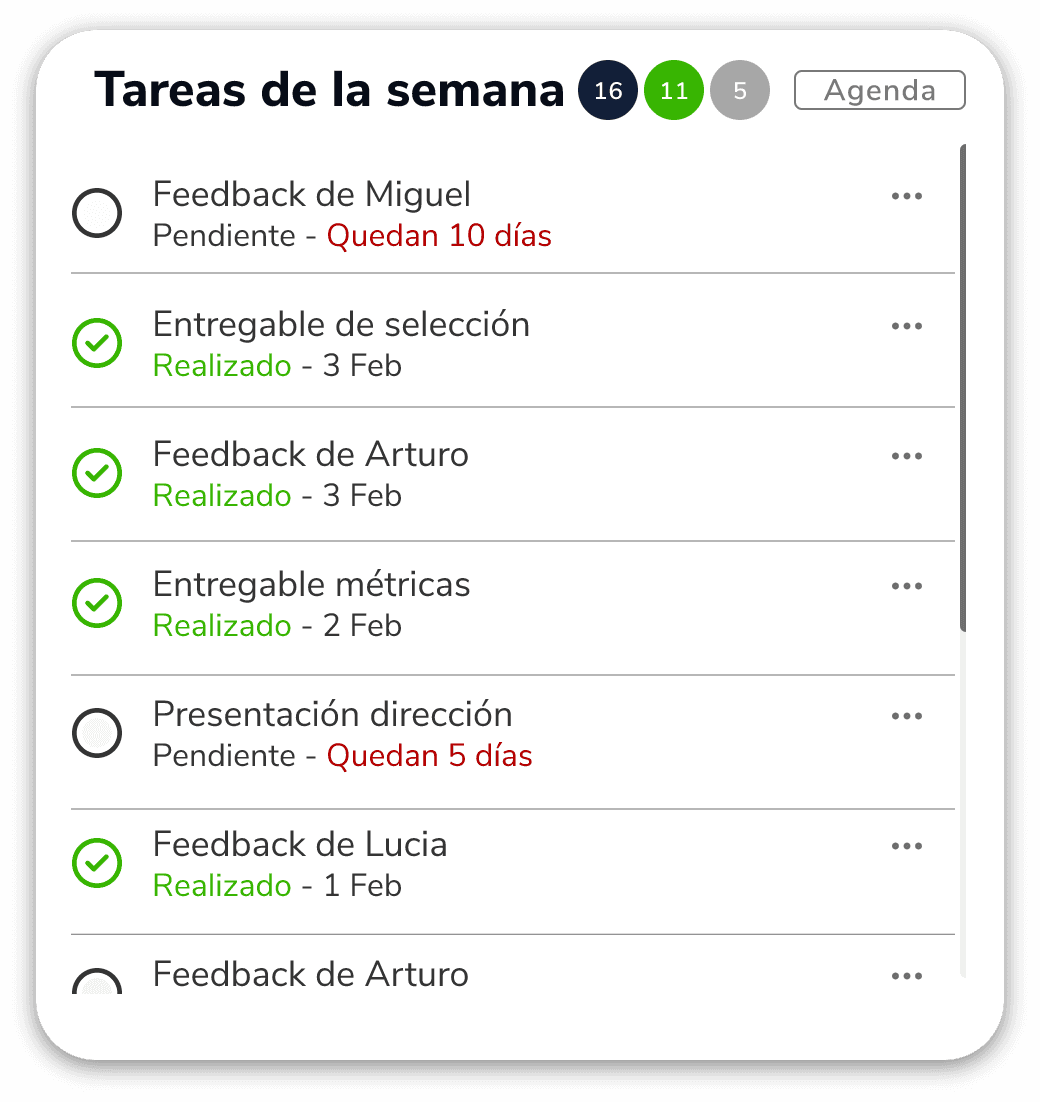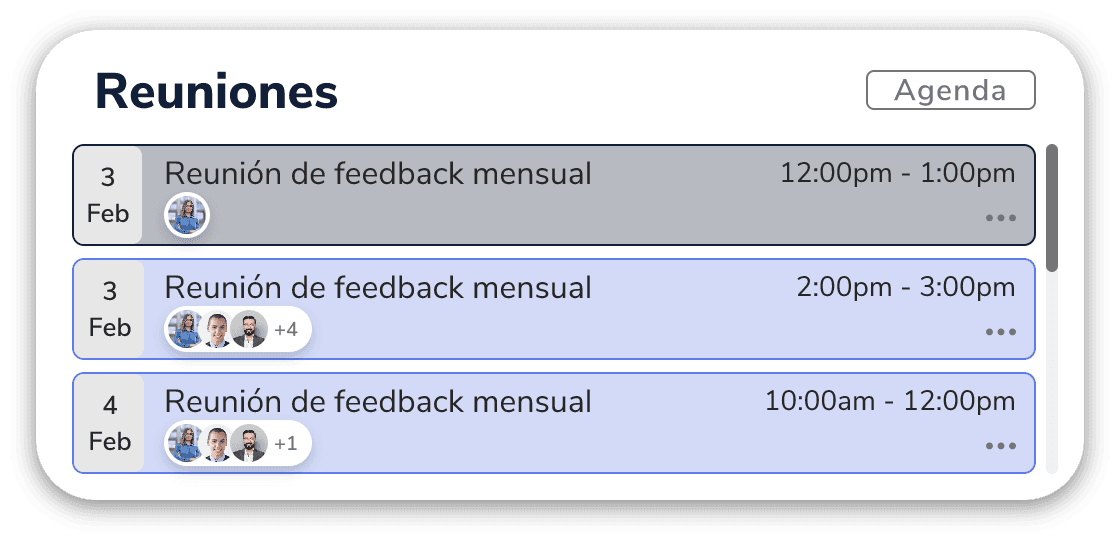 Optimiza la eficiencia diaria al ofrecer a cada colaborador un Muro Central interactivo, donde puede acceder a su calendario, tareas asignadas, reuniones, noticias, y un resumen claro de sus métricas.