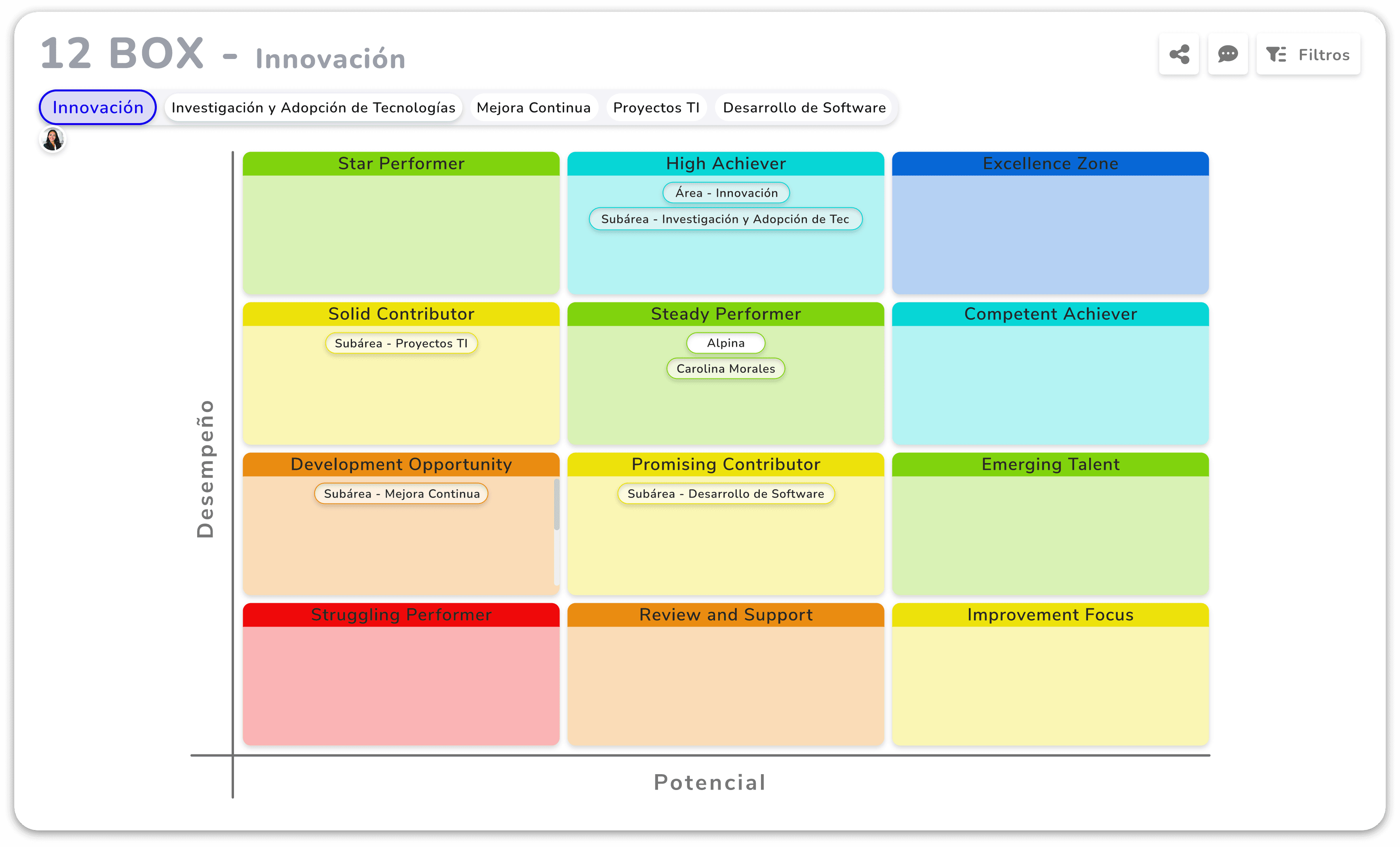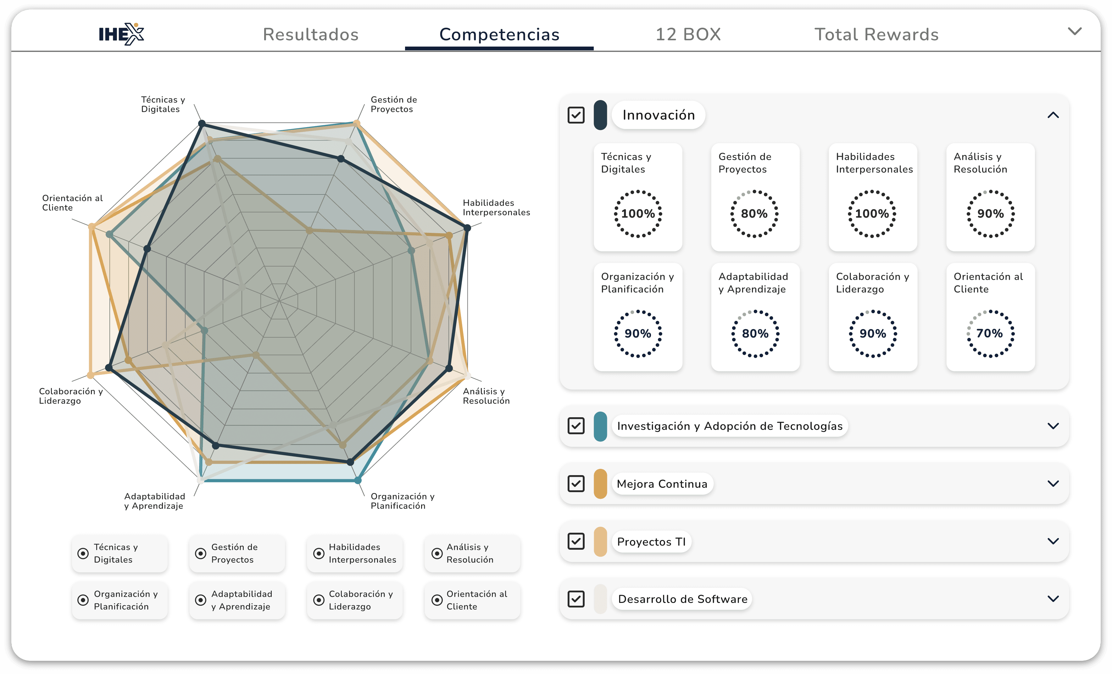IHEX evalúa productividad y resultados en performance, incluyendo KPIs, OKRs y tareas; competencias técnicas y blandas; y cultura organizacional.